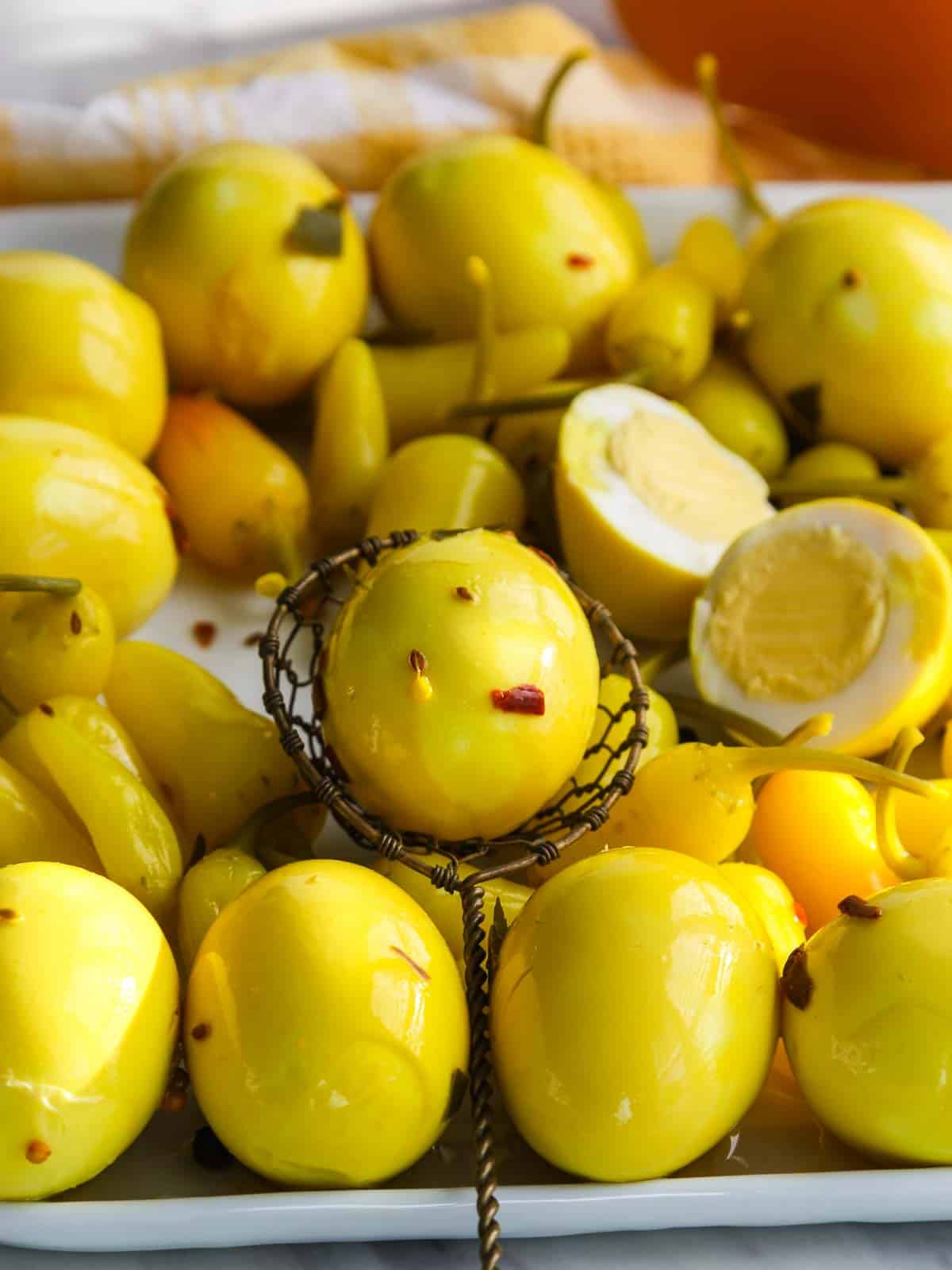 - Peel all the shells off, and place eggs in a large clean jar. I use a clamp-style 2-quart large jar. Next, pour the 12 oz jar of Hot Yellow Peppers with their pickling mixture into your large glass jar on top.